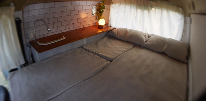 La van viene equipada para dos personas y un niño. Tiene dos asientos delanteros y uno trasero, todos con cinturón de seguridad. Es self powered, lo que significa que no necesitás conectarte a ninguna fuente de electricidad para tener luz ya que cuenta con paneles solares.